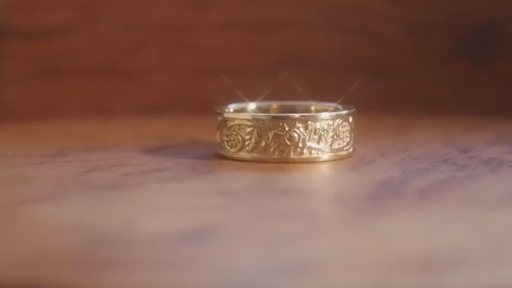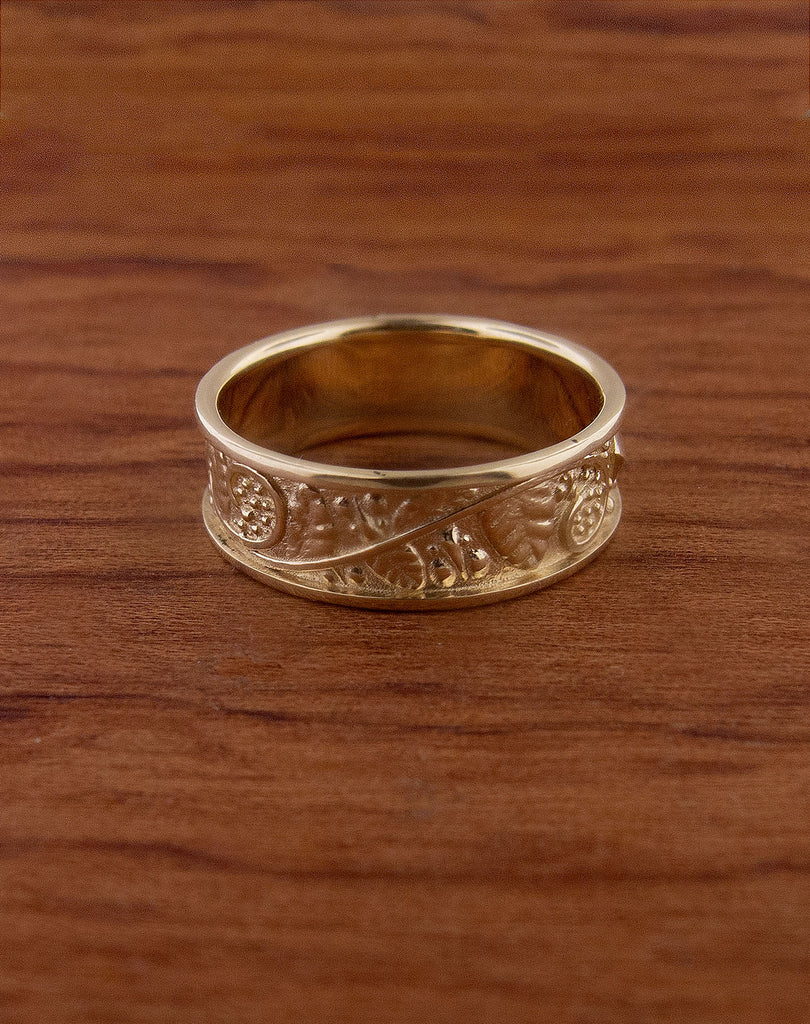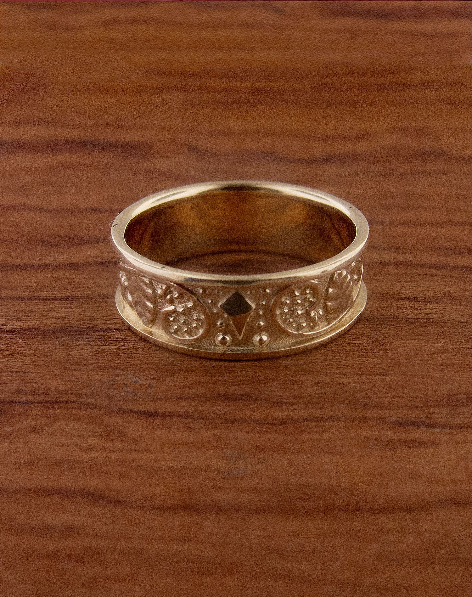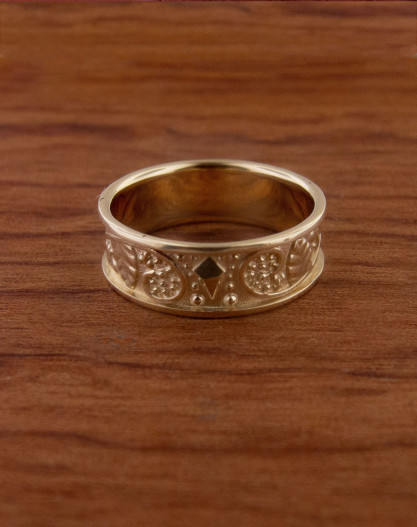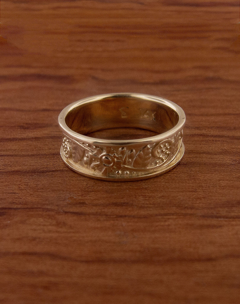 A friend of mine asked me to create a wedding ring for her fiancé based on a painting he had done soon after he decided to propose to her (but before he had actually proposed). She sent me a copy of the painting (see last image), and at first I had no idea what to do with it—it was compelling, but had no really linear sections that would work around the band of a ring!