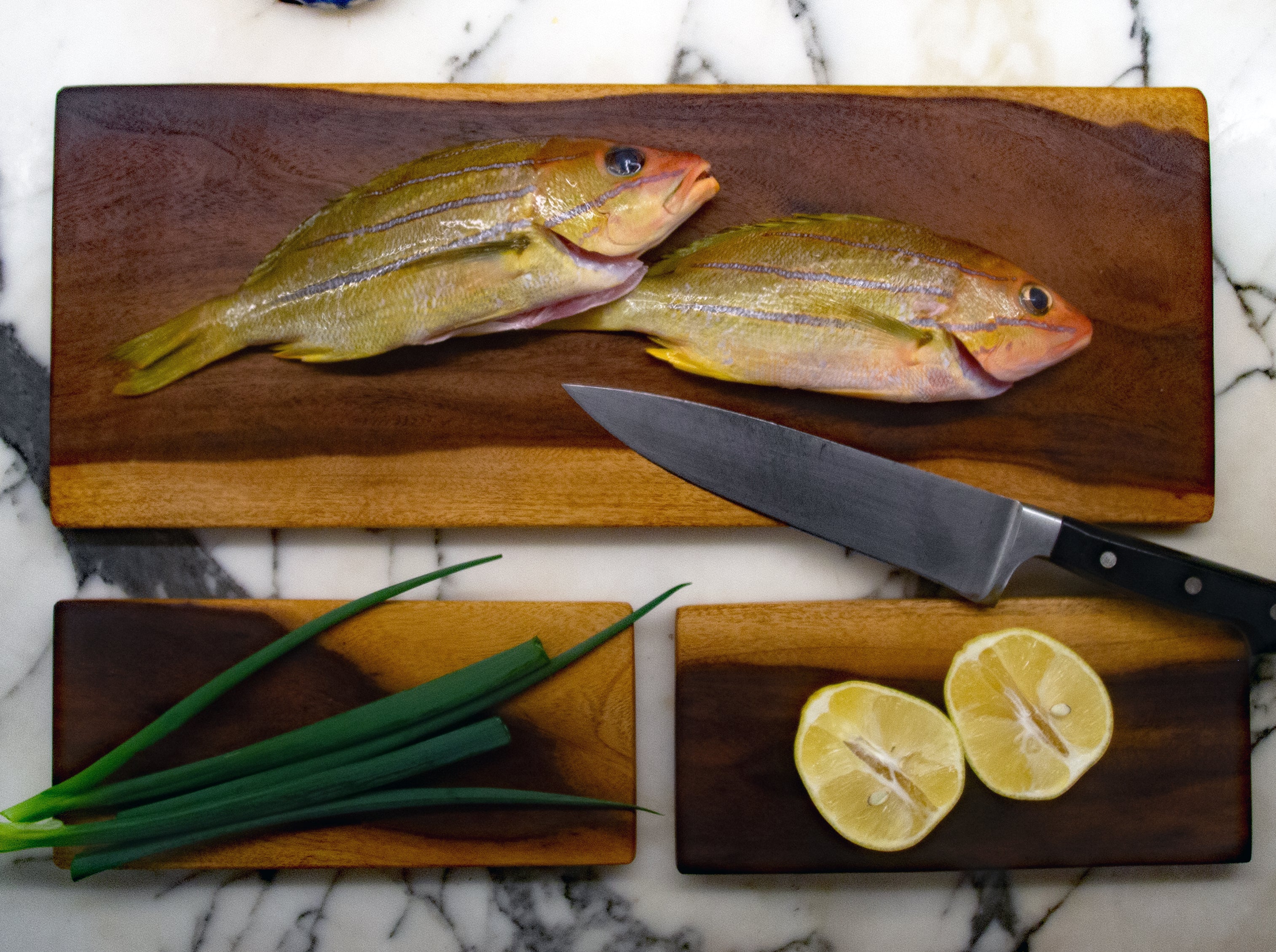 For the inaugural meal, we went hyper-local. The lemon and the green onions in the second photo both came from my own garden, and the taʻape (bluestripe snapper, an invasive species—eat the invasives!) were caught the day before by local fishermen.
